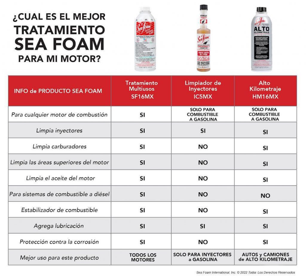 Para este trabajo, Sea Foam ofrece su Limpiador de Inyectores, que es un tratamiento concentrado, formulado para la limpieza y lubricación de los inyectores, conductos de combustible y la parte superior del motor. Su utilización de manera constante evita la formación de depósitos en los conductos, válvulas e inyectores; además restaura el rendimiento del combustible y ayuda a reducir las emisiones.
